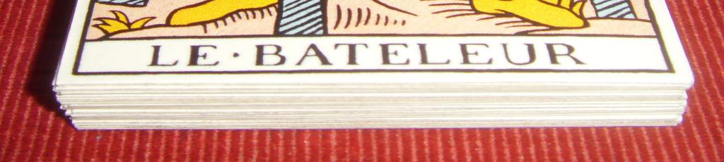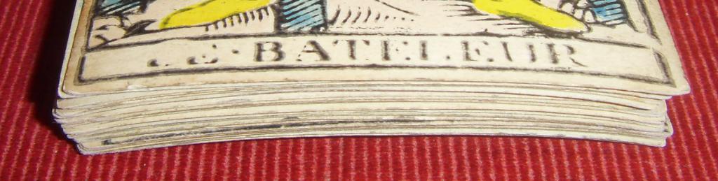 À ces particularités de l'artisanat viennent se joindre les effets de bombage ou de gondolement, qui même s'ils sont moins marqués que dans la plupart des jeux anciens (voir ci-contre) se produisent également. Pour entretenir son tarot, on peut atténuer ces effets en le plaçant de temps à autres, entre deux plans bien serrés, comme le faisaient les gérants de bistrot d'antan avec leur presse à jeu de cartes spécialisement dédiées à cet usage. La finition des cartes consiste au lissage manuel des quatre côtés, afin qu'elles glissent parfaitement en main lors de leur utilisation et si besoin, à l'arrondissage des coins. Arrivé à ce stade, le tarot est prêt pour sa mise en boite (facsimilé et restitutions) ou pour sa mise en couleur au pinceau (cartes à offrir). |